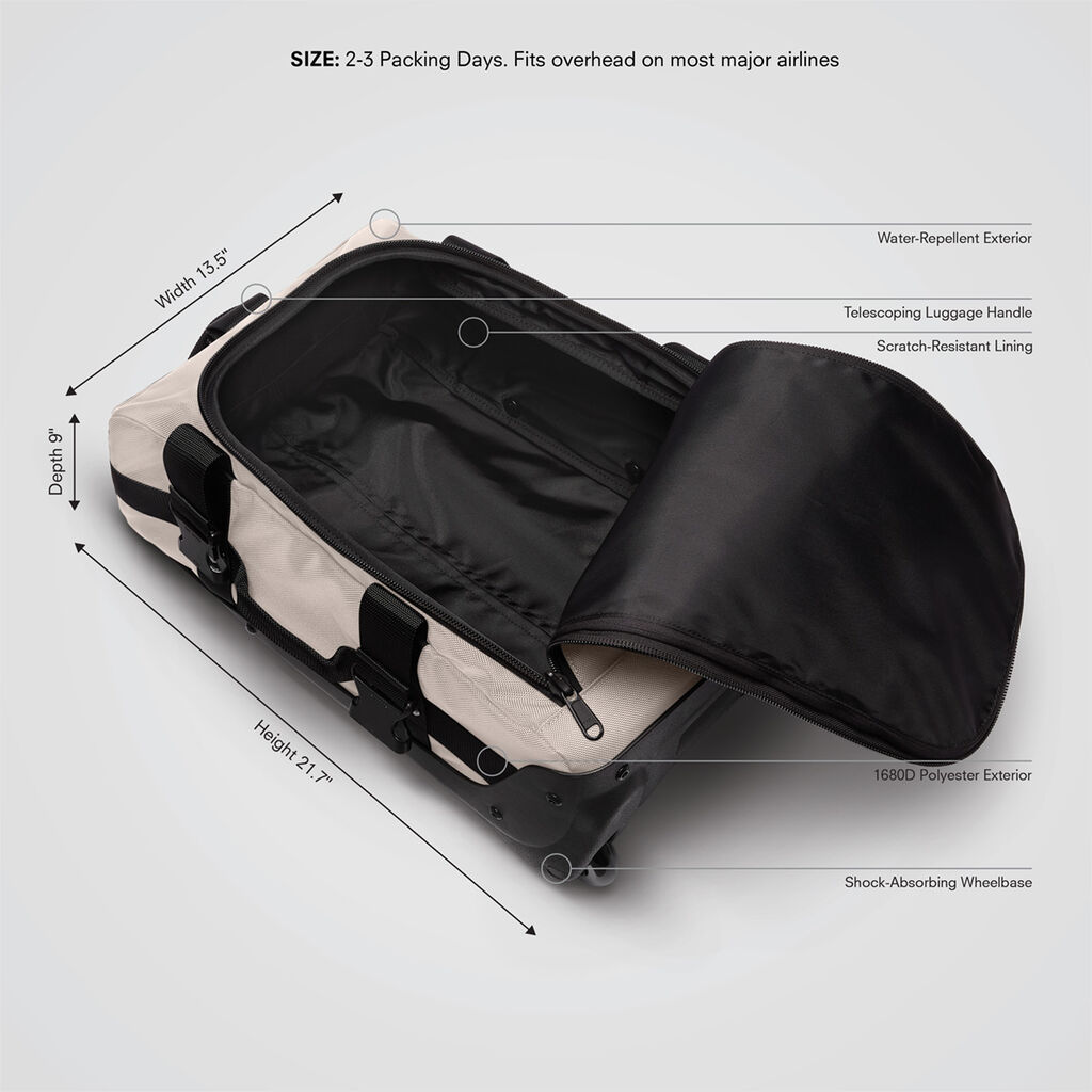 Lightweight and durable, with essential storage, the Mini Rolling Duffle is perfect for a weekend golf getaway—sized to meet the maximum allowable carry-on dimensions on nearly all airlines. With a lightly-structured, modern wheeled-duffle design, pack efficiently in this travel duffle and keep your belongings protected with a shock-absorbing wheelbase. Roll on and roll off with everything you need.